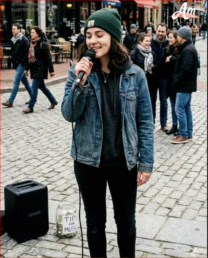 But here it was, clear as day, sung by a young woman standing across the square, eyes closed, with a serene smile.
